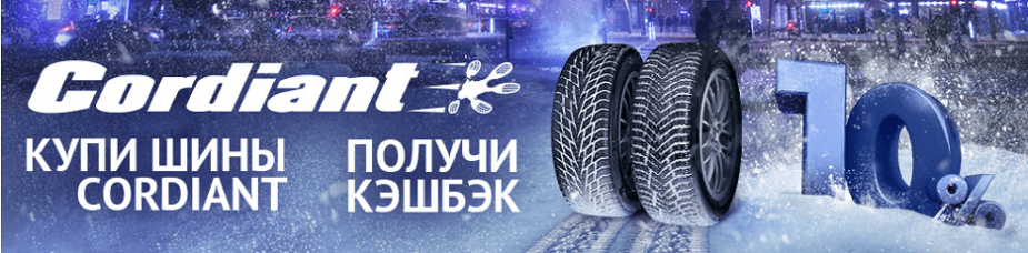 Дорогие друзья! Интернет-магазин 74kolesa.RU объявляет акцию на получение Cashback 10% при покупке комплекта шин Cordiant!