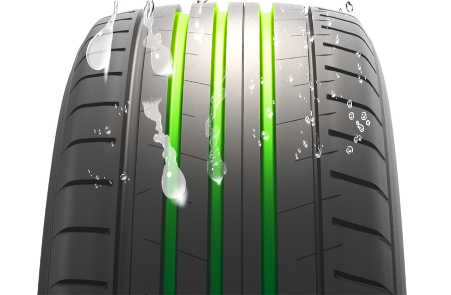 Протекторная часть шины содержит три большие дренажные канавки в центральной области. Этот дизайн эффективно снижает риск аквапланирования, особенно при высоких скоростях. Широкие плечевые зоны представляют собой непрерывные и прочные элементы, что значительно повышает точность управления, особенно при маневрировании и торможении. Протекторный рисунок характеризуется оптимальным расположением элементов и их формой, что значительно снижает уровень шума, особенно на неровных дорогах. Беговая поверхность протектора изготовлена из специальной резиновой смеси с добавлением полимеров, которые повышают прочность на разрыв и растяжение на молекулярном уровне. Это улучшает сцепные свойства шины, делая ее более устойчивой к износу и абразивному воздействию.
