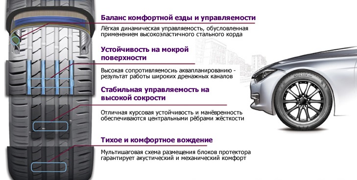 Шина обладает оптимизированным дизайном протекторного рисунка, включающего три продольных ребра с наклонными насечками. Это обеспечивает сохранение курсовой устойчивости, улучшенную тормозную и разгонную динамику, а также защиту от аквапланирования и повышенное сцепление с дорогой. Наружная плечевая зона с жесткими резиновыми шашками обеспечивает надежный контакт с дорогой при скоростном преодолении извилистых участков и маневрировании.
