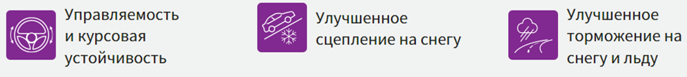 - «двойной» V-образный дизайн протекторного рисунка обеспечивает эффективность на любом зимнем покрытии;